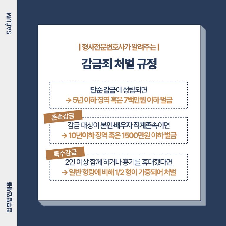 만약 단순 감금이 성립되면 5년 이하 징역 혹은 700만 원 이하 벌금이 내려오게 됩니다. 그러나 헤어진 연인·가족 감금의 경우 상황에 따라 달라질 수 있는데요. 만일 감금의 대상이 본인이나 혹은 배우자의 직계존속에 해당하면, 존속감금이 적용되어 10년 이하 징역 혹은 천5백만 원 이하 벌금형에 처하게 됩니다. 만일 이와 같은 행위를 2인 이상의 함께 하거나 혹은 위험한 물건을 휴대하여 저질렀다면 특수감금이 적용되고, 일반적인 형량에 비해 1/2의 형이 가중됩니다.