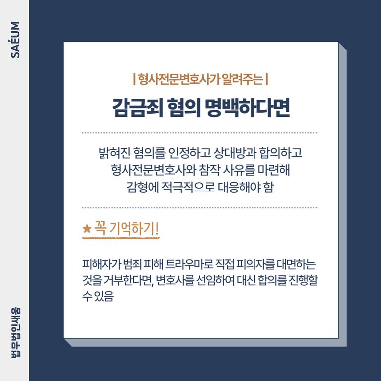 본인이 감금 혐의를 벗을 수 없는 상황일 경우, 우선 밝혀진 혐의에 대한 것을 인정하고 상대방과 합의하는 것이 좋습니다. 만일 피해자가 범죄 피해 트라우마로 인해서 직접 피의자와 대면하는 것을 거부한다면 형사전문변호사를 선임하여 대신 합의를 진행하실 수 있습니다.