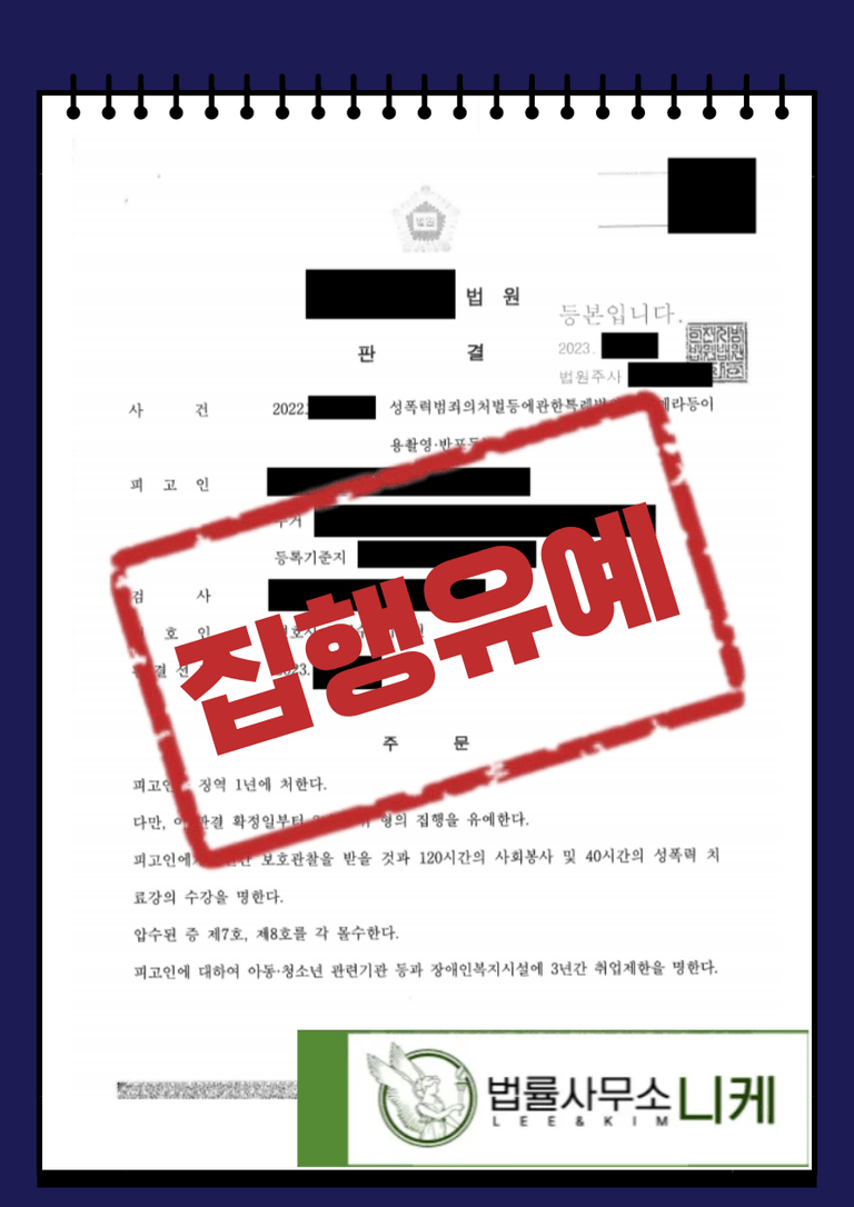 그 결과 의뢰인은 성폭력범죄의처벌등에관한특례법위반(카메라등이용촬영,반포등) 혐의를 받고 법정형으로 최소 벌금형 최대 7년의 징역형을 선고받을 수 있었음에도 불구하고 집행유예 처분을 받을 수 있었습니다.