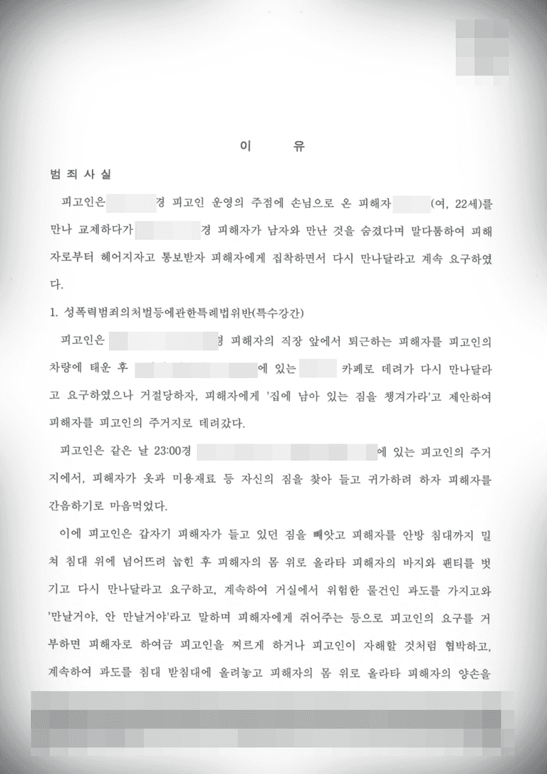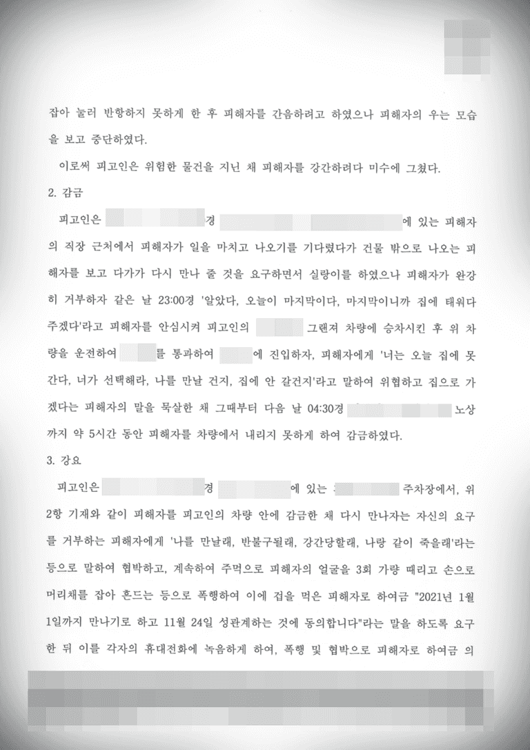 본 사건 의뢰인께선 전 연인이었던 피해자에게 이별 통보를 받은 후 다시 만날 것을 요구하며 특수강간 미수, 강간, 감금, 강요, 폭행 등의 범죄 혐의로 정식기소되었습니다.