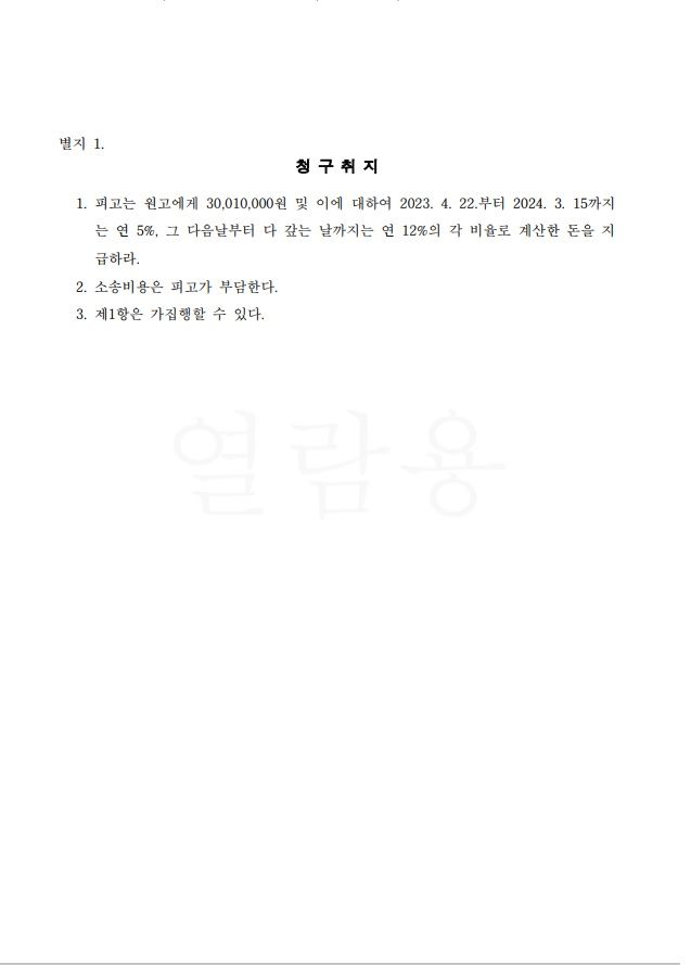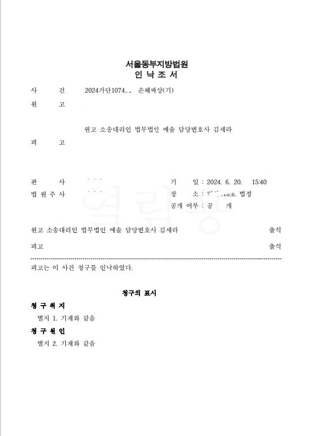 위와 같이 변론한 결과,피고는 원고(의뢰인)의 청구에 대하여 원고 청구(위자료30,010,000원 및 이에 대한 이자)전부를 인낙함으로써 인낙조서를 받을 수 있었습니다.