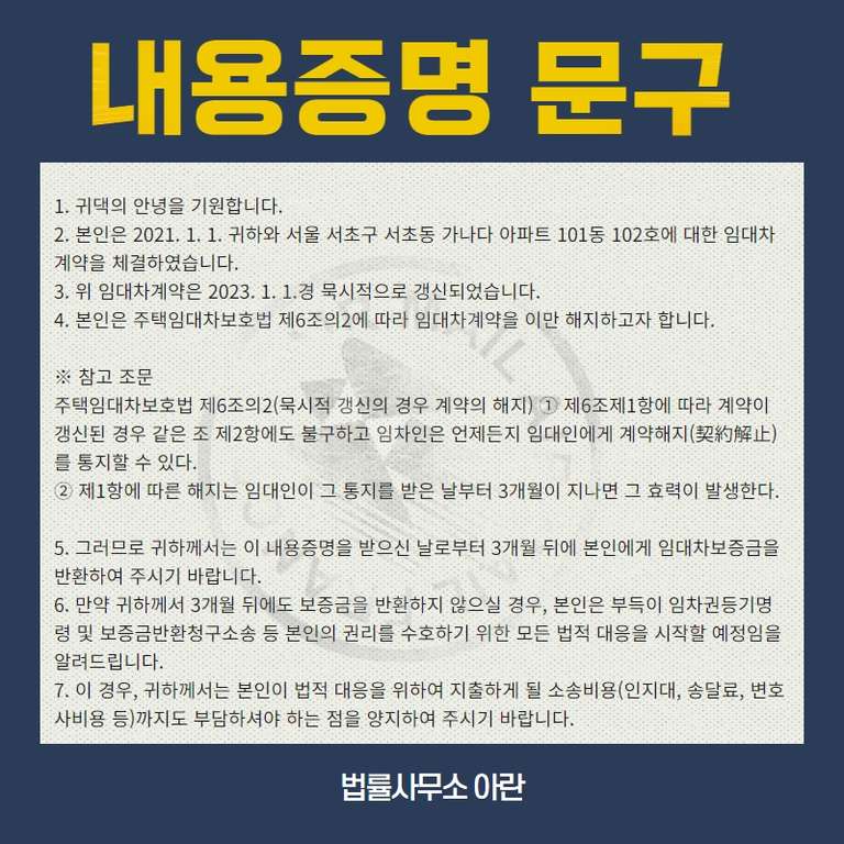 5. 그러므로 귀하께서는 이 내용증명을 받으신 날로부터 3개월 뒤에 본인에게 임대차보증금을 반환하여 주시기 바랍니다.