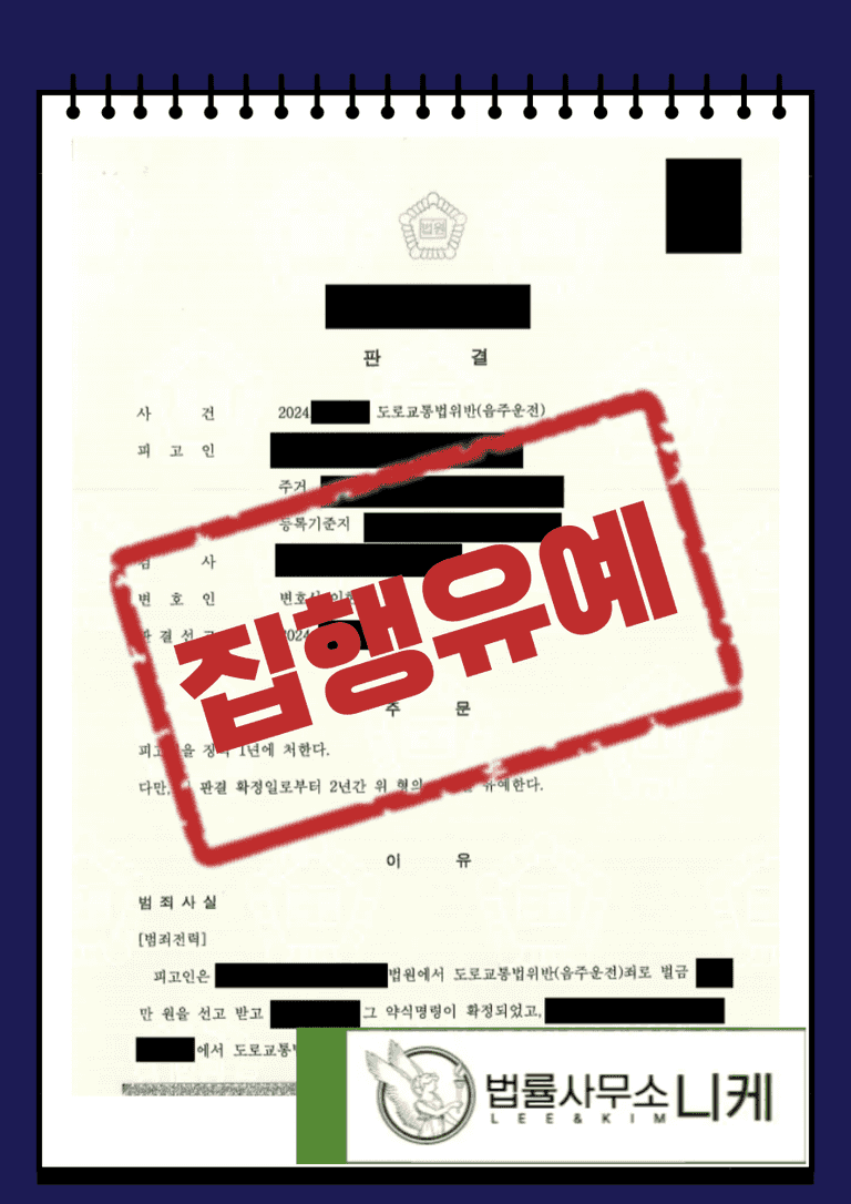 그 결과 의뢰인은 도로교통법위반(음주운전) 혐의를 받고 법정형으로 최소 벌금형 최대 5년 이하의 징역형을 선고받을 수 있었음에도 불구하고 집행유예 처분을 받을 수 있었습니다.