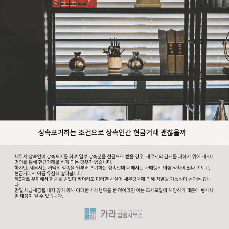 채무자 상속인이 상속포기를 하며 일부 상속분을 현금으로 받을 경우, 세무서의 감시를 피하기 위해 제3자 명의를 통해 현금거래를 하게 되는 경우가 있습니다.