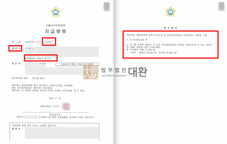법무법인 대환에서는 의뢰인의 대금 지급 청구권이 명백하였기에 상대방은 법원의 지급명령에 대해 다투지 않을 것을 예상하고 정식 민사소송 대신에 지급명령 신청으로 진행하였고, 예상대로 원고 전부승소로 확정되어 강제집행으로 나아갈 수 있었습니다. 청구권이 명백하고 상대방이 존부를 다툴 가능성이 적은 경우 절차 진행의 신속성과 비용적인 측면을 고려하여 정식 민사소송 절차가 아닌 지급명령 신청으로 채권보전이 가능하다는 점을 시사하는 사건입니다.