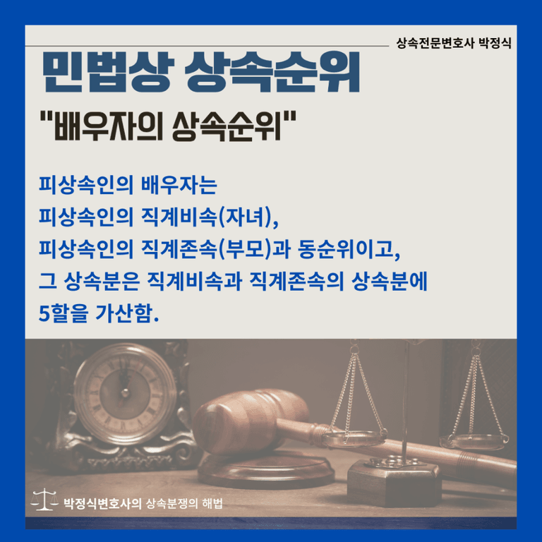 또한 민법 제1003조에서는 피상속인의 배우자의 상속순위에 관하여 별도록 규정하고 있는데, 제1항에서는 “민법 제1000조 제1항 제1호(직계비속), 제2호(직계존속)의 규정에 의한 상속인이 있는 경우 그 상속인과 동순위로 공동상속인이 되고, 그 상속인이 없는 때에는 단독상속인이 된다”라고 규정하고 있습니다.