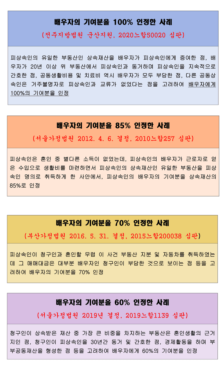 위와 같이 배우자의 기여분을 인정한 실제 사례들을 소개하면, 아래와 같이 실제로 배우자의 기여분을 100%로 인정한 사례부터 60% , 30%, 20% 를 인정한 사례들도 있으며, 실제로 배우자의 기여분에 대해서는 어는 정도는 인정해주는 것이 현재 가정법원의 실무경향입니다.