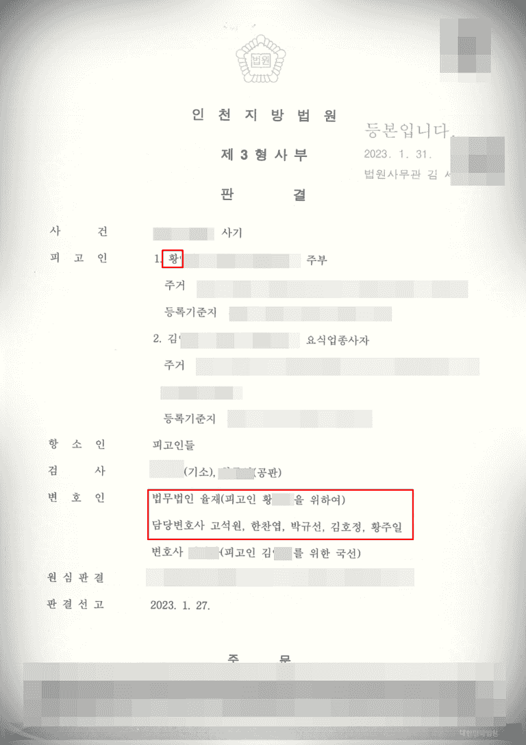 본 사건 의뢰인께서 사기를 저지른 것은 사실입니다. 다만 저희 율재는 의뢰인께서 법이 인정하는 정당하고 합법적인 처벌을 받고 반성과 교화로 나아갈 수 있도록 노력합니다. 만약 그 과정에서 단 1%라도 무죄의 가능성이 발견된다면 이 또한 최선을 다해 밝혀내고 있습니다.