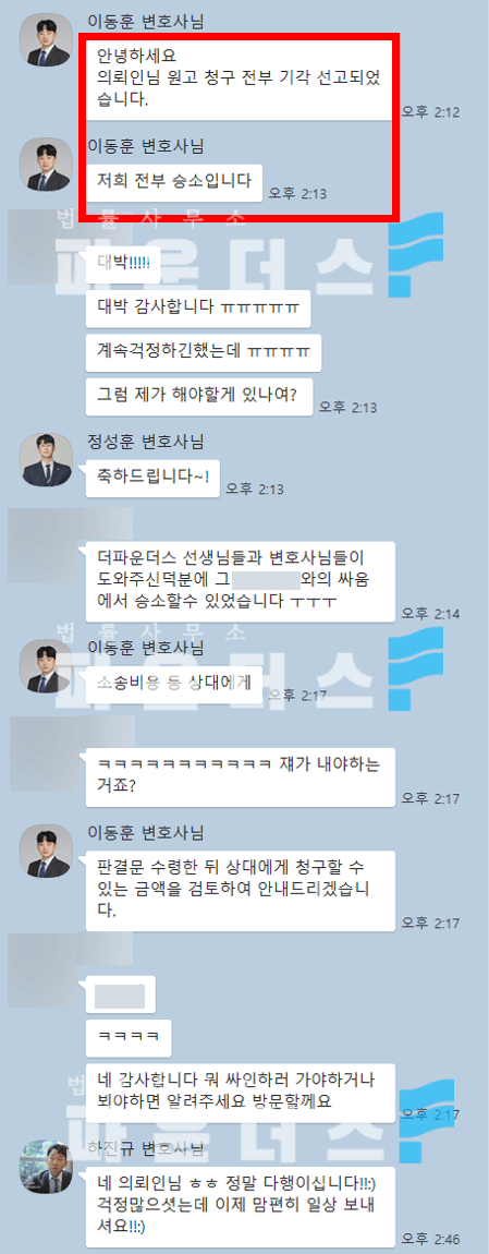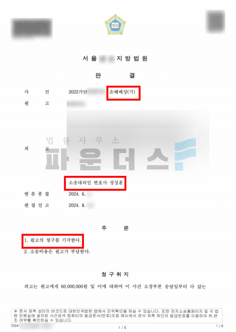 마지막으로 변호인은 민사 변론 절차를 통해 원고가 주장하는 손해의 부분이 의뢰인의 불법행위로 인해 발생했다 볼 수 없음을 논리적으로 주장해 나가며 원고의 청구를 모두 기각해줄 것을 요청하였습니다.