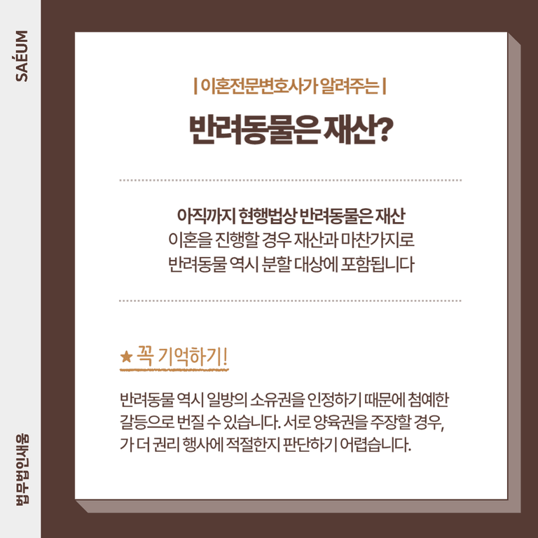 이에 따라 최근에는 이혼소송을 진행하면서 위자료나 재산분할이 아닌 동물과 연관된 문제로 심각한 다툼이 생기는 경우가 흔합니다. 관련하여 도움이 필요하다면, 아래의 글을 먼저 읽어 보신 후에 전문변호사를 찾아 조력을 구하시기 바랍니다.