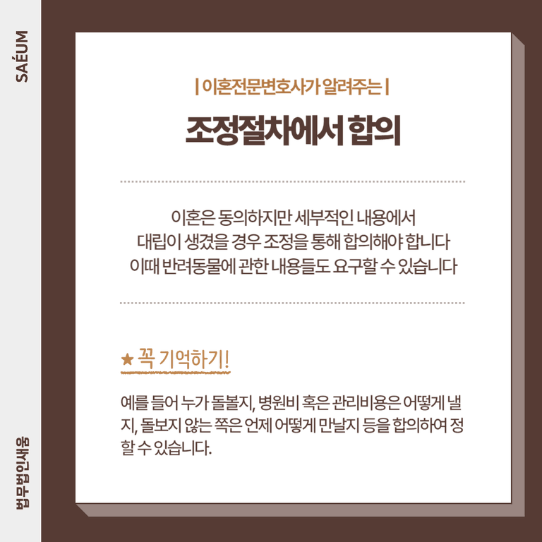 조정조서는 판결문과 동일한 효력을 갖지만, 판사의 판결이 아닌 당사자의 의견을 반영한 내용을 충분히 반영하는 서류이기 때문에 반려견에 관한 사항들을 요구할 수 있습니다. 예를 들어 누가 돌볼지, 병원비 혹은 관리비용은 어떻게 낼지, 돌보지 않는 쪽은 어떻게 만날지 등에 관하여 합의해서 정할 수 있는 것입니다.