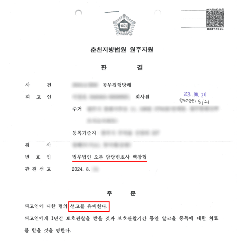 사건 당사자는 공무집행방해로 입건된 후 본 변호인과 상담을 진행하고 본 변호인을 통해 피해 경찰 공무원의 처벌 불원서를 받았고, 직장에서의 퇴직 위험, 재발방지대책의 충실한 수립 등을 통해 선고유예 판결을 받게 되었습니다.