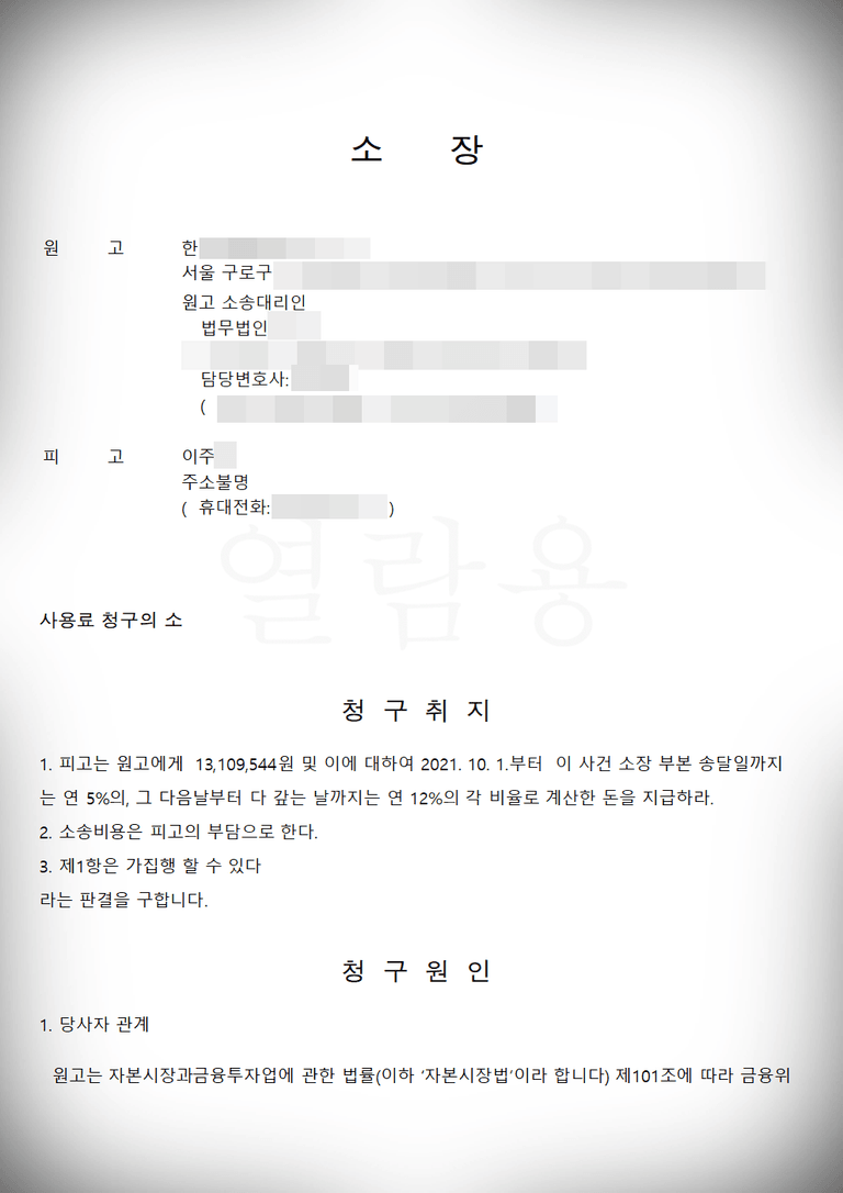 원고 측은 의뢰인에게 투자자문 이용 계약의 중도 해지에 따른 위약금과 미지급 이용료 청구 소송을 제기하였습니다(아래 소장 참고).