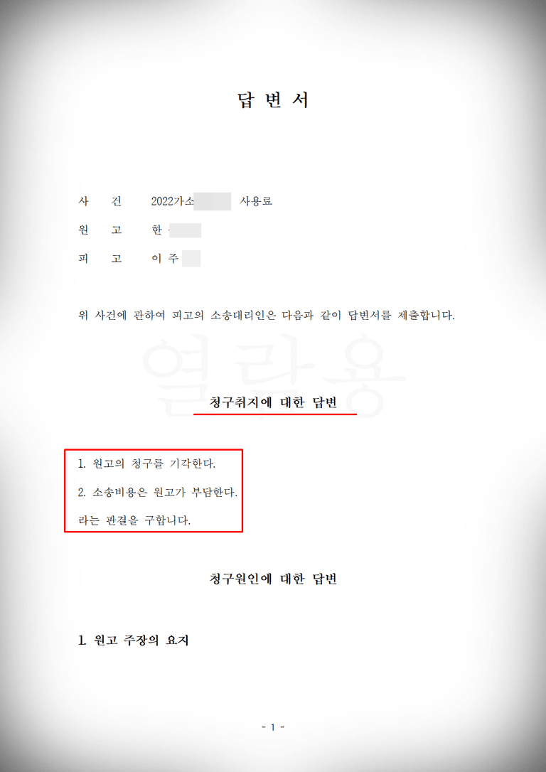 2. 이에 저희 율재는 원고 측 주장을 전면 반박하여 적법한 계약 해지에 따른 위약금과 미지급 이용료가 아닌 원고 측의 의뢰인 기망과 계약서 위조 등에 따른 사기 행위임을 증명하는 답변서로 대응하였습니다(아래 답변서 참고).