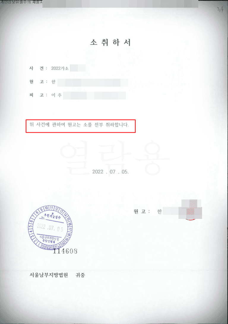 4. 결국 원고 측은 자신들의 민사소송을 취하하였으며 현재 저희 의뢰인 측과 형사 고소에 따른 합의를 조율하여 상당한 금액의 합의금을 지급해야 했습니다(아래 소 취하서 참고).