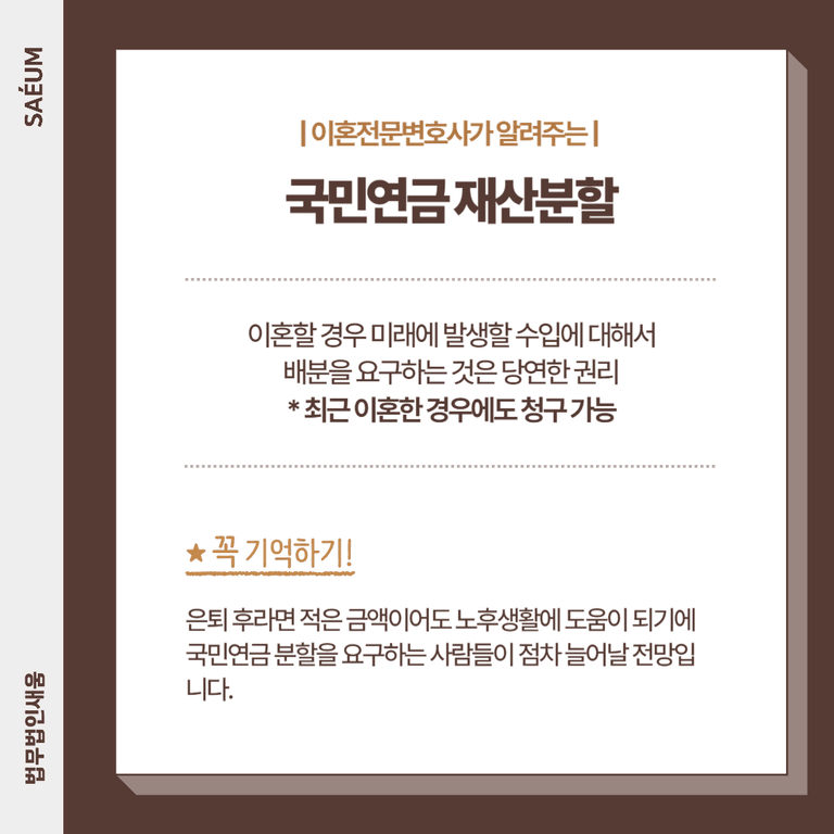 실제 분할 금액을 떠나서, 이혼할 때 미래에 발생할 수 있는 수입에 대해서 배분을 요구하는 것은 자신의 당연한 권리입니다. 아무리 크지 않은 돈이라 해도, 사실상 결혼생활을 유지하면서 나의 도움으로 배우자가 연금을 축적할 수 있었다면, 당연히 그에 상응하는 기여도만큼 몫을 주장해야 합니다.