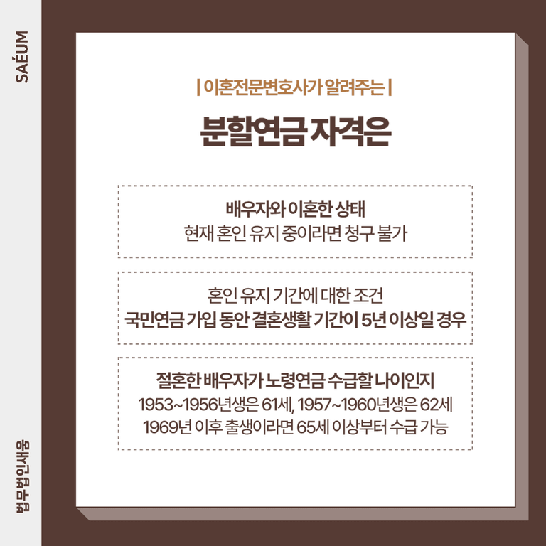 하지만 아무나 해당 분할을 진행하는 것은 아닙니다. 국민연금공단이 제시하는 일정한 자격요건을 충족하는 때에만 허용하는데요.