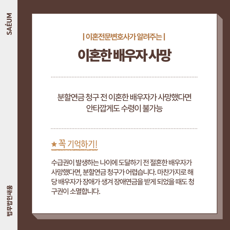 그런데 만일 국민연금의 분할을 요구하기 전 절혼하였던 배우자가 죽음에 이르렀다면 어떻게 될까요? 이 경우에도 수령이 가능할까요?