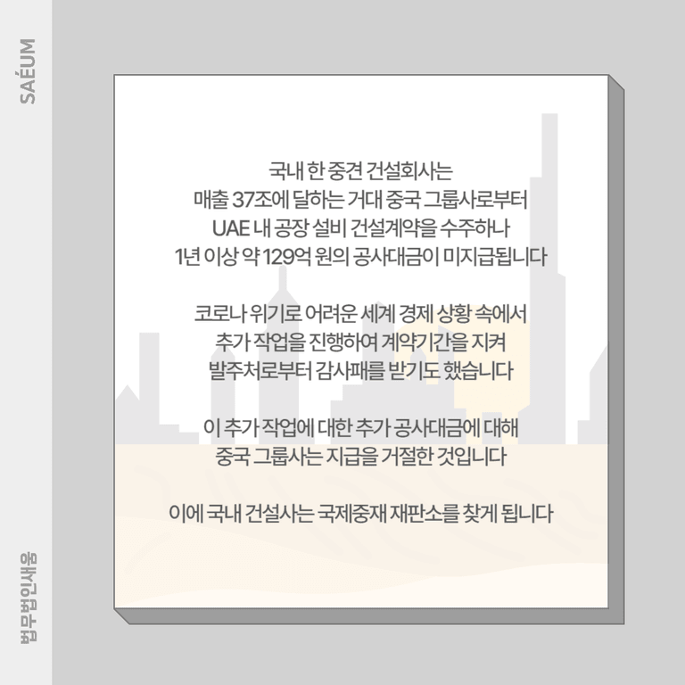 규모가 크지 않은 기업으로 프로젝트의 진행 시기에 맞게 대금을 받지 못하면 심각한 자금난에 처하여 회사가 존폐 위기에 놓였는데 가까스로 국제중재를 통해 해결하게 된 것입니다. 참고로 한국의 중소 건설기업이 해외건설 공사대금과 관련한 법적 분쟁에서 과거 승소한 경험이 없었는데요. 과연 어떠한 결과가 나왔을까요?