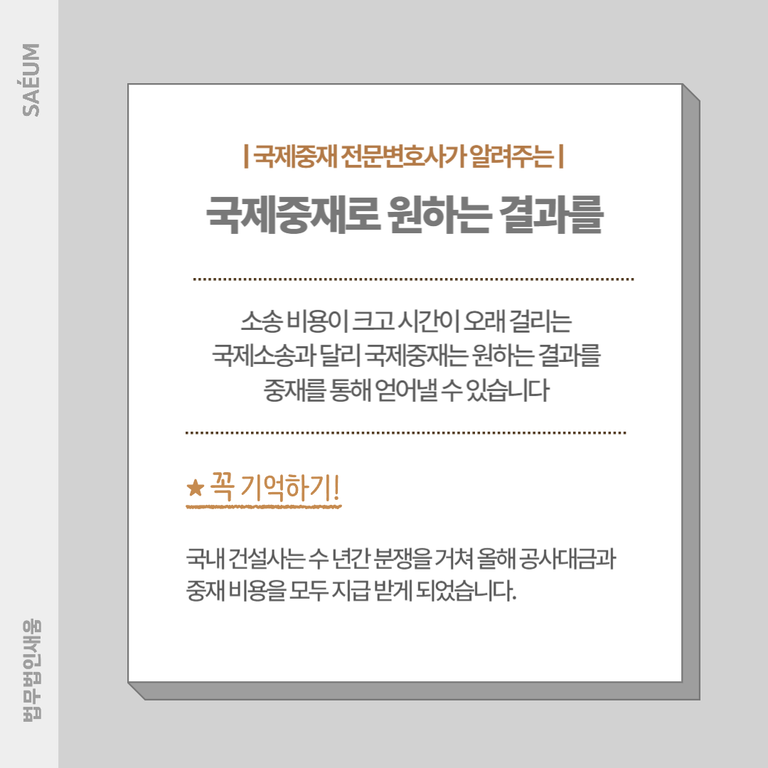 특히 서두의 사건으로 알 수 있듯이, 공사대금 미지급의 문제가 발생하였을 때 해외에서 진행하면 금액의 규모가 매우 커 원만하게 해결이 되지 않으면 심각한 경제적인 타격을 입을 수 있어 법적인 분쟁을 고려해야 하는데요. 이럴 때 금액과 관계없이 국제중재를 통해 사건을 진행한다면, 더 신속하게 미수금의 해결이 가능합니다.