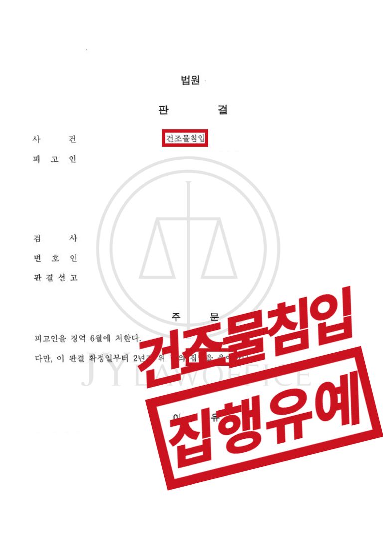 이와 같은 변호인의 노력에 따라, 의뢰인은 건조물침입 혐의에 대해 집행유예의 처분을 받고 무사히 사건을 종결시킬 수 있었습니다.