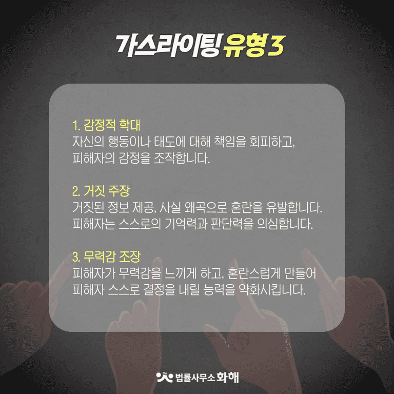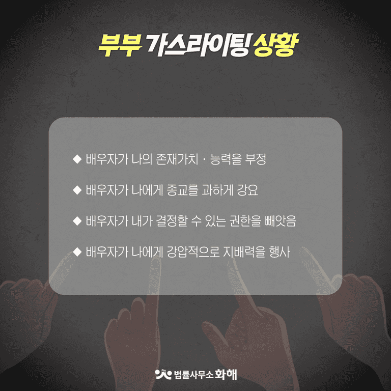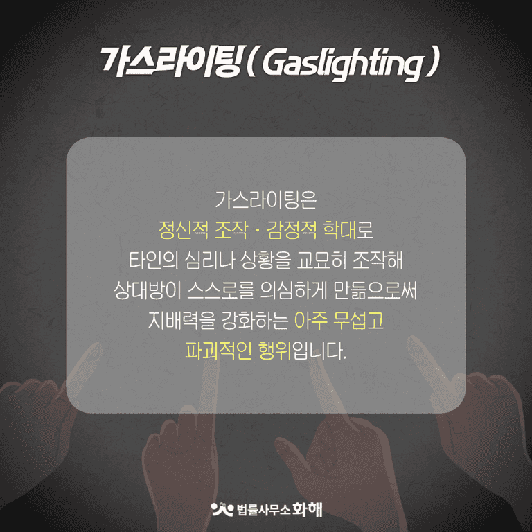 저희 법률사무소 화해를 찾아주시는 분들 중에서도 가스라이팅으로 고통받고 계신 분들이 많습니다. ‘아내’나 ‘남편’에게 가스라이팅을 당하고 있다는 것을 뒤늦게 깨닫고 이혼을 준비하는 분들이 계신데요. 가스라이팅은 아주 교묘하게 상대의 정신을 조작하고, 감정적으로 학대하기 때문에 당하는지도 모른 채 고통받는 상황이 이어지게 됩니다.