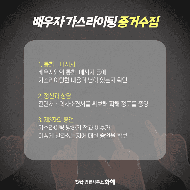가스라이팅을 사유로 이혼하기 위해서는 남편 · 아내 유책에 대한 증거부터 확보하는 것이 가장 중요합니다.