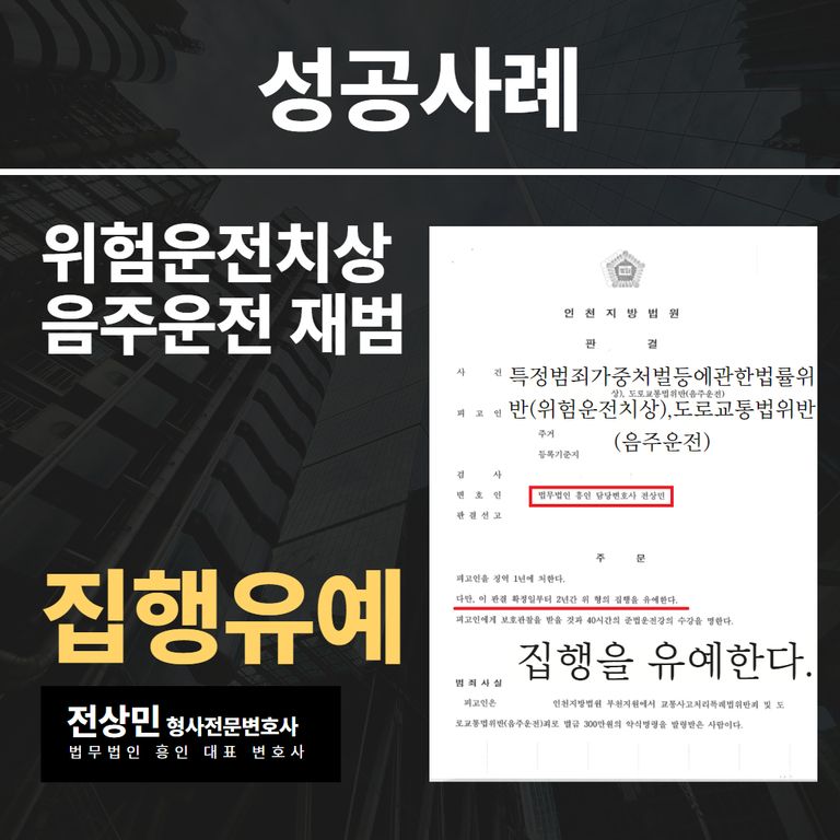 그 결과 도주치상 혐의가 다행히도 ‘위험운전치상’ 혐의로 변경되었고, 실형이 선고될 수도 있는 사안이었지만, 의뢰인은 ‘집행유예’로 선처받아 일상으로 돌아갈 수 있게 되었습니다.