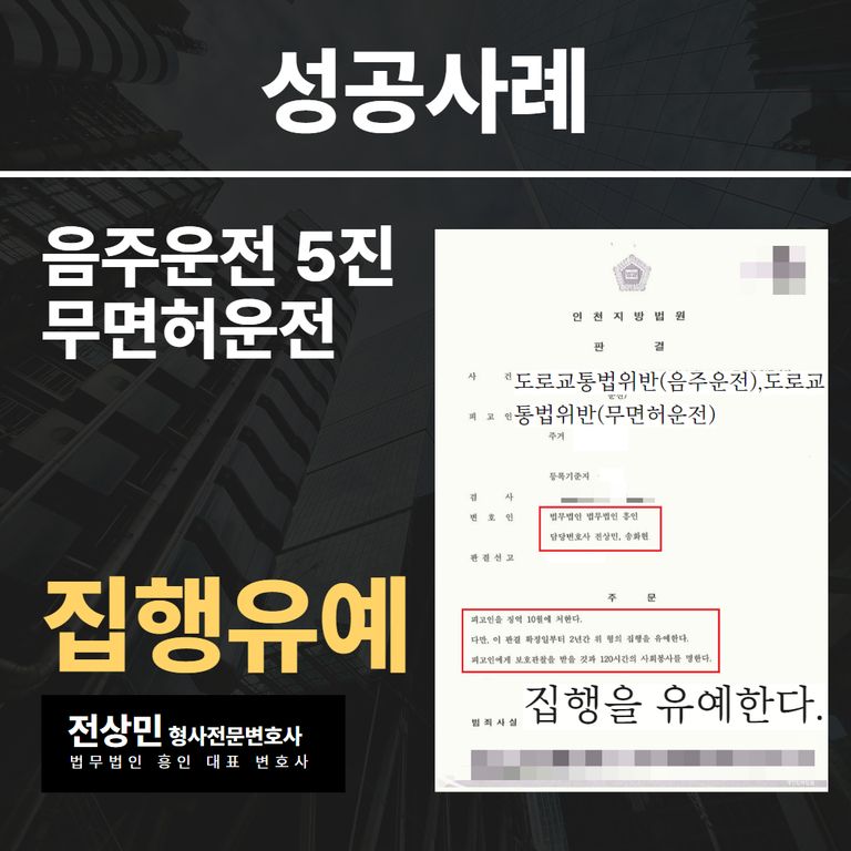 이번 사안의 경우 의뢰인은 5진과 더불어 높은 혈중알코올농도로 단속되어 실형이 예상되는 상황이었지만, 다행히도 저의 도움을 받아 집행유예로 사건을 종결시킬 수 있었습니다.