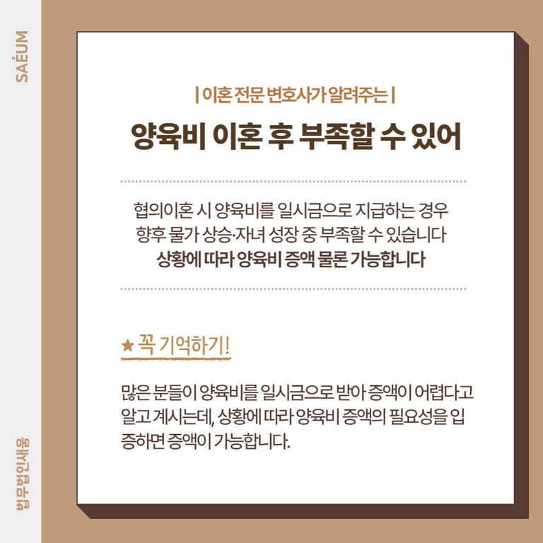 이렇게 양육비에 관하여 알아보았습니다. 사전에 일시금으로 받았다고 하더라도 그 필요를 입증할 수 있다면 얼마든지 청구하는 것이 가능한데요. 양육비는 자녀의 정당한 권리이자 더 나은 환경에서 성장할 수 있도록 만들어 주는 역할을 하기도 합니다. 그러니 자녀를 위해서라도 상대방과 대화가 껄끄럽다고 해서 혹은 소송이 복잡하고 번거롭다고 해서 그대로 방임하기보다는 법적으로 대응하여 필요한 만큼의 증액을 시도해 보시기 바랍니다.