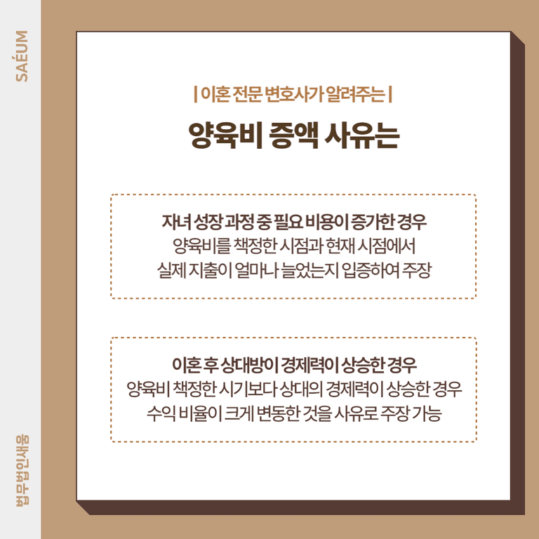 꼭 자녀에 들어가는 비용이 증가한 것이 아니라도 양육비소송 청구가 가능합니다. 양육비는 자녀의 연령과 부모의 수익 등을 고려하여 자녀에게 들어가는 비용을 산정, 부모의 경제력 차이에 맞게 분담하는 것이기 때문인데요. 따라서 상대방이 이혼 당시와 달리 경제적으로 여유로워지게 되었다면 수익의 비율이 크게 변동한 것을 사유로 하여서 다시금 증액을 요청할 수 있습니다.