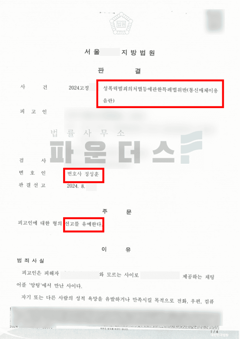 수사 진행 중 A 씨가 20대 여성이 아닌 남성인 사실과 동일한 수법을 이용하여 다른 이용자들을 통매음 혐의로 고소한 점이 밝혀졌지만 그럼에도 의뢰인이 성기사진을 전송한 점이 성적 수치심을 유발할 수 있는 행위라 인정되어 벌금형 200만원 선고를 받게 되었습니다.