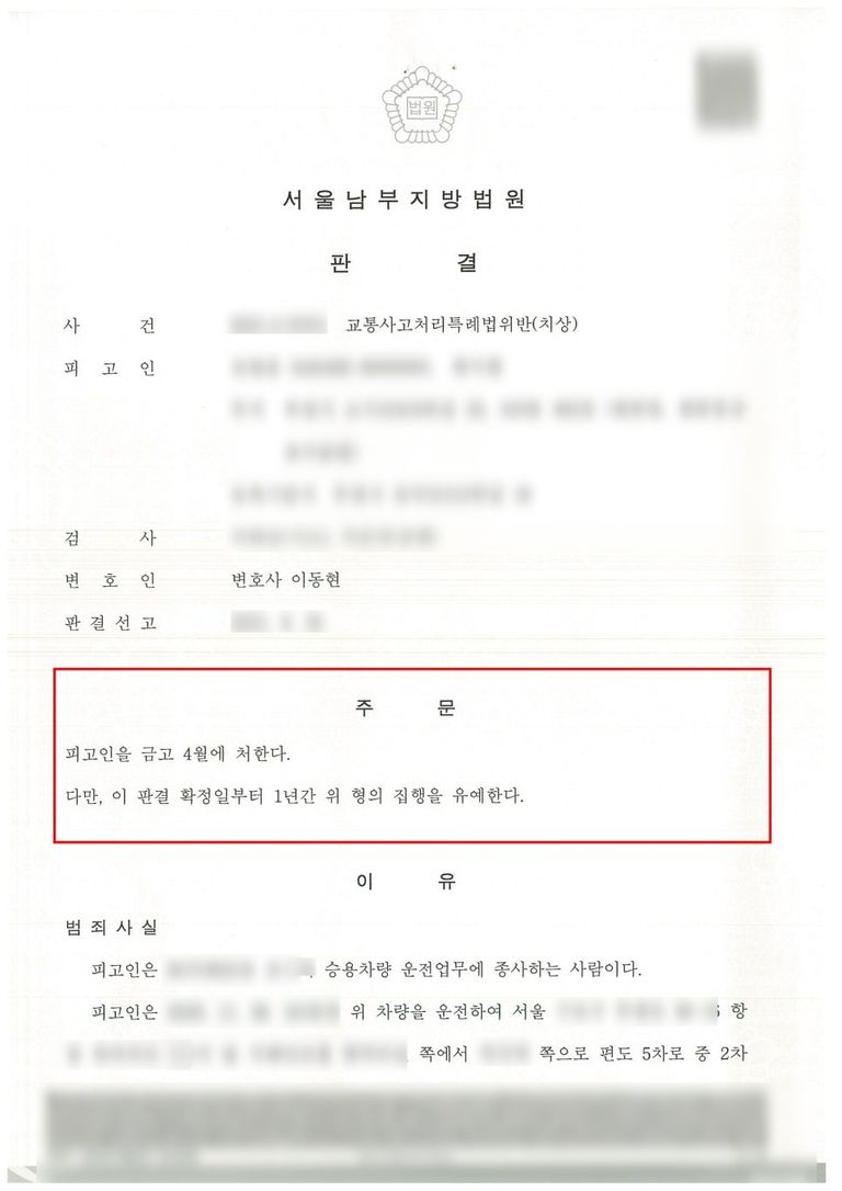이후 저는 반성문, 탄원서, 정신과 진료 내역서, 교통 관련 교육 이수증, 합의서 등 여러 양형자료를 바탕으로 A씨는 신호를 잘못 인지하여 이 사건 교통사고가 발생하게 되었다는 점, A씨는 진심으로 반성하고 있다는 점, A씨는 B씨와 민·형사상 합의를 하였다는 점, A씨는 다시는 이러한 일이 발생하지 않도록 하기 위해서 스스로 교통 관련 교육을 이수하는 등 최선을 다하고 있다는 점, A씨가 다른 범죄로 여러 번 처벌받은 이력이 있으나 동종전과는 전혀 없다는 점 등을 적극적으로 어필하며 '이번에 한하여 마지막으로 집행유예 판결을 선고해 달라'는 내용의 변호인의견서를 제출하였습니다.