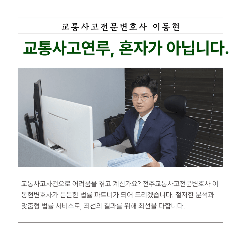 안녕하세요. 저는 수백 건의 교통사고 사건에서 무죄, 무혐의, 기소유예, 가벼운 벌금형, 집행유예 등 많은 좋은 결과를 도출해 낸 전주교통사고전문변호사 이동현변호사입니다.