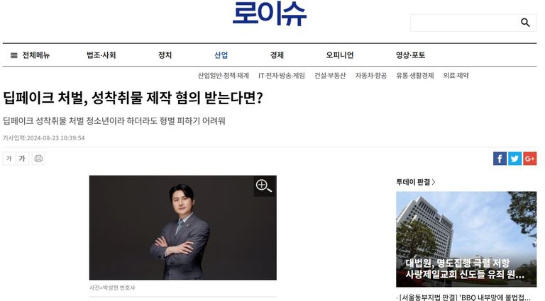 박성현 대표 변호사는 “성인을 대상으로 반포하기 위해 제작했다면 5년 이하의 징역 또는 5천만 원 이하 벌금형이 선고될 수 있다 이를 반포, 제공해도 동일하게 처벌된다.”며 “딥페이크 성착취물 성범죄의 경우 주변 지인을 대상으로 범행하는 경우가 많다 보니 청소년의 경우 미성년자를 대상으로 범죄를 저지르는 경우가 많다. 이 경우 아청물 제작죄가 되어서 무기 또는 5년 이상의 징역으로 처벌되고, 이를 타인에게 배포, 제공하면 3년 이상의 징역으로 처벌된다.”고 하였다.