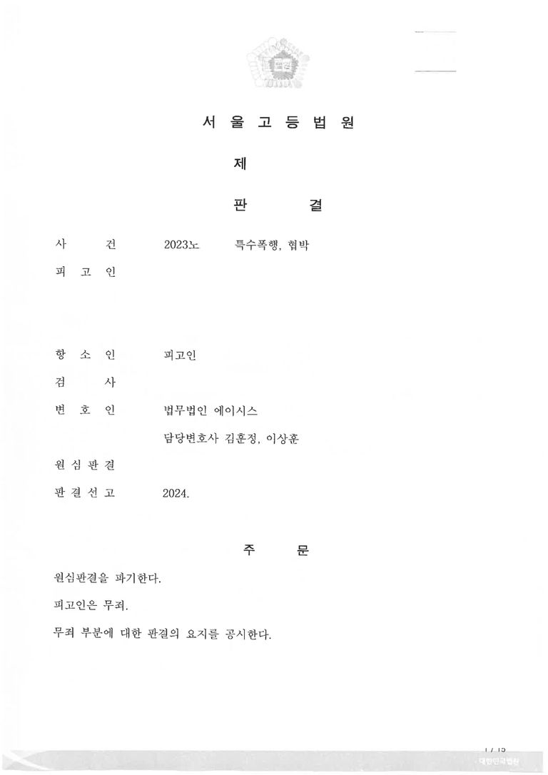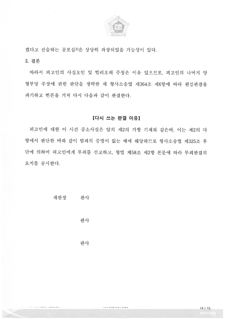 항소심 재판부는 변호인의 주장을 모두 받아들여, 유죄를 선고했던 원심을 파기하고 모든 공소사실에 대해 전부무죄를 선고하였습니다.