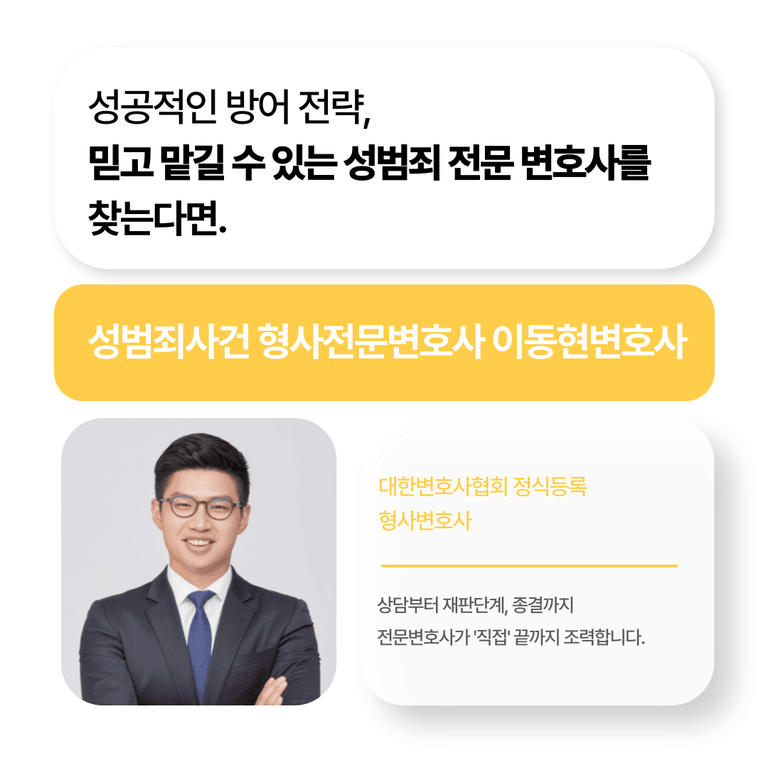 저는 성범죄 사건에 대한 풍부한 경험과 전문성을 바탕으로, 의뢰인의 권리를 최대한 보호하며, 유리한 결과를 이끌어낼 수 있도록 최선을 다하고 있습니다. 성범죄 혐의로 어려움에 처해 계시다면, 혼자 고민하지 마시고, 지금 바로 상담을 통해 정확한 법적 조언과 전략을 받아보시기 바랍니다.