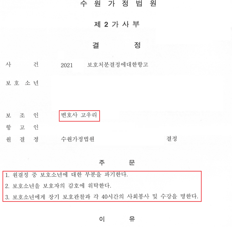 항고 사건의 보조인으로서, 보호소년이 초범이고 반성하고 있는 점, 보호자가 구체적인 지도 계획을 가지고 있는 점 등을 보여줄 수 있는 자료를 준비, 제출하였고 장기보호관찰, 보호자위탁 처분을 받아 소년원에 송치되지 않을 수 있었습니다.
