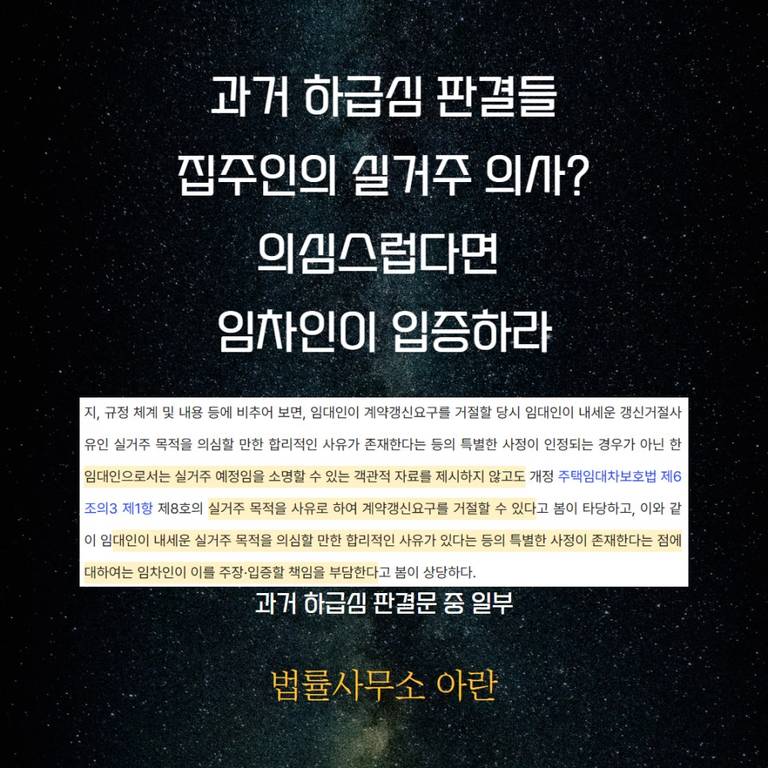 왜냐하면 이 사건 대법원 판결이 선고되기 전까지만 하더라도 기존 하급심 판례들에서는 "집주인은 특별한 자료를 제시하지 않고도 실거주 목적을 들어 임차인의 갱신요구를 거절할 수 있다. 이 경우 세입자가 '집주인의 실거주 목적을 의심할만한 합리적인 사유가 있다'라는 점을 입증하지 못하는 한 이사를 가야 한다"라고 판단해 왔기 때문입니다.