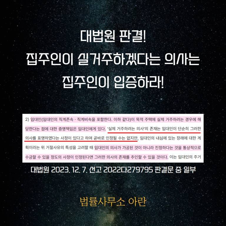 대법원은 먼저 "임대인이 목적 주택에 실제 거주하려는 경우에 해당한다는 점"을 임대인이 증명해야 한다고 판단했습니다. 대법원 판결을 좀 더 자세히 볼까요?