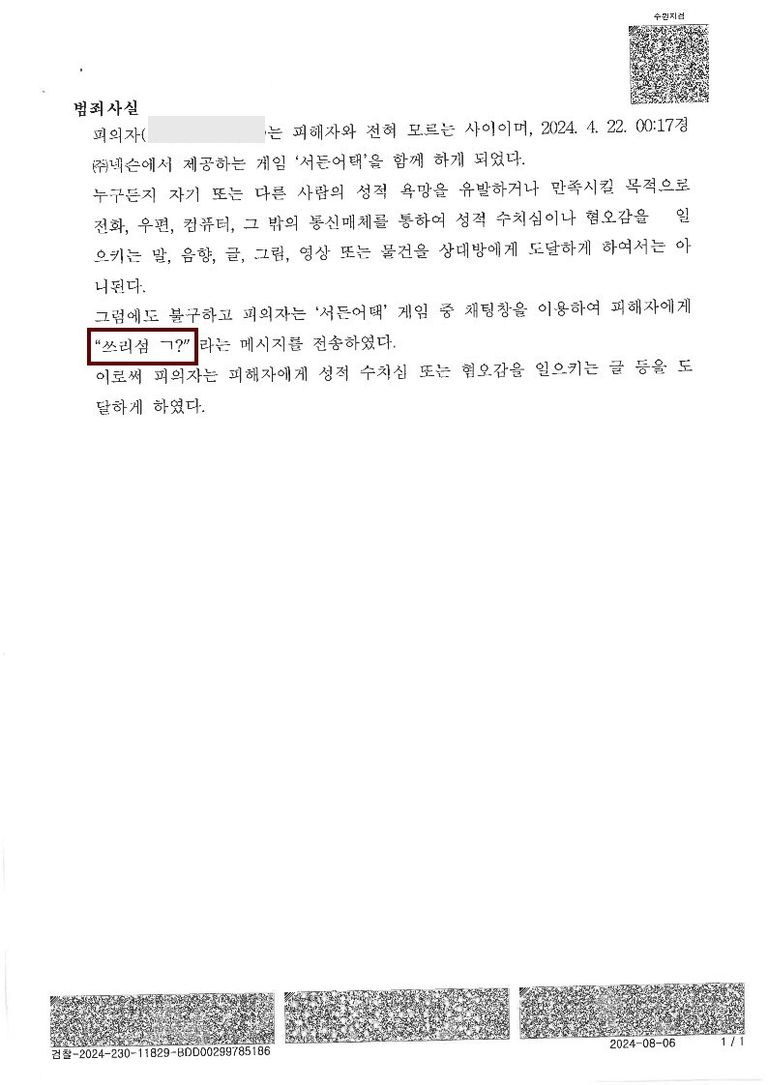 그런데, 수사관이 사건을 검찰로 송치하는 믿기 어려운 일이 발생했습니다. 수사관은 '성적 비하나 조롱의 목적도 성적 목적'이라는, 이미 게임 통매음에서 논리가 완전히 깨진 대법원 2018도9775 판례를 근거로 들었고, 심지어 피의자가 직접 채팅하지 않은 내용까지 포함하여 피의자에게 혐의가 있다고 판단하였습니다.