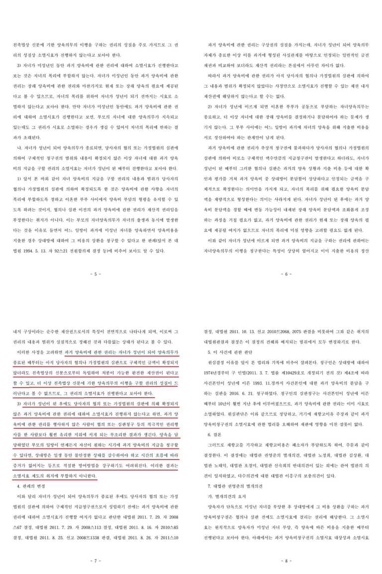 원심법원인 수원지방법원은 자녀가 성년이 되어 양육의무가 종료된 후에도 당사자의 협의 또는 가정법원의 심판에 의하여 구체적인 지급청구권으로서 성립하기 전에는 과거 양육비에 관한 권리에 대하여 소멸시효가 진행할 여지가 없다고 판단한 대법원 2011. 7. 29. 자 2008스67 결정, 대법원 2011. 7. 29. 자 2008스113 결정, 대법원 2011. 8. 16. 자 2010스85 결정, 대법원 2011. 8. 25. 선고 2008므1338 판결, 대법원 2011. 8. 26. 자 2011스10 결정, 대법원 2011. 10. 13. 선고 2010므2068, 2075 판결에도 불구하고, 심판청구는 사건본인이 성년에 이른 때부터 10년이 훨씬 지난 후에 이루어졌으므로, 과거 양육비에 관한 권리는 이미 시효로 소멸하였다고 판결하였는데, 하급심으로서 선례가 있는 대법원 판례와 어긋나는 판단을 한 것입니다.