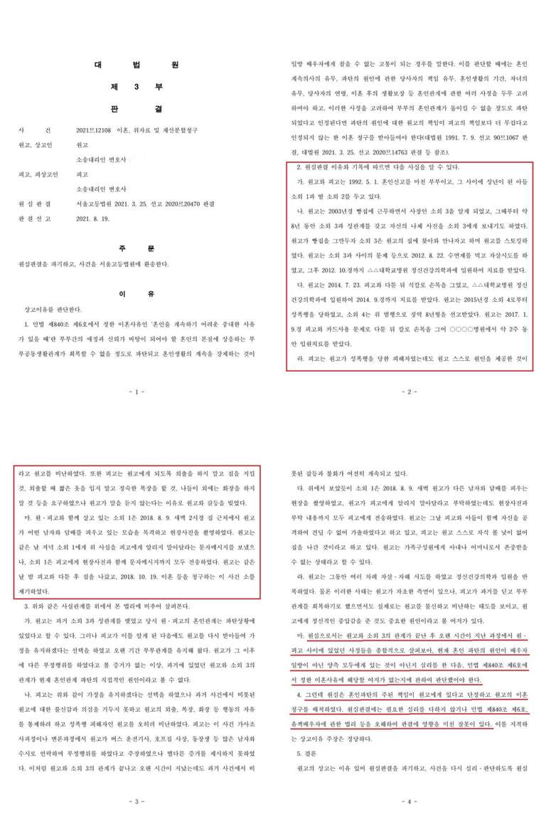 “갑과 을이 각자 전혼에서 낳은 자녀들을 데리고 재혼한 후 갑의 자녀들의 성과 본을 을의 성과 본으로 변경하고 그에 맞춰 개명도 하였는데, 갑이 을을 상대로 을의 갑에 대한 구속, 폭언 등으로 혼인관계가 파탄되었다고 주장하며 이혼을 구한 사안에서, 제반 사정에 비추어 갑과 을의 관계가 더 이상 회복될 수 없을 정도로 파탄에 이르렀다고 단정하기 어렵다,”고 판시하였습니다(수원가정법원 2020. 12. 23. 선고 2020드단500409 판결).
