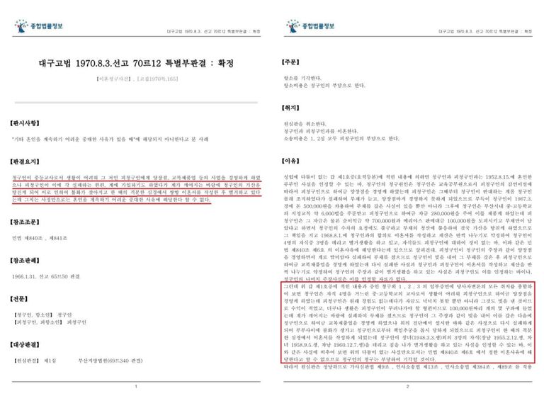 “피청구인이 혼인생활을 계속할 수 없을 정도로 청구인과 시부모를 부당하게 대우하였다거나 가정을 돌보지 아니하였다고 인정하기는 어렵고 오히려 시어머니가 중풍으로 누워 있을 때 3년간이나 그 용변을 받아내면서 간호하느라고 그 용변냄새 때문에 담배를 피운 일이 있고 청구인의 여자관계 때문에 다툰 일이 있을 뿐이어서 혼인을 계속하기 어려운 중대한 사유가 있다고 보기 어렵다.”고 하였습니다(대법원 1984. 6. 26. 선고 83므46 판결).