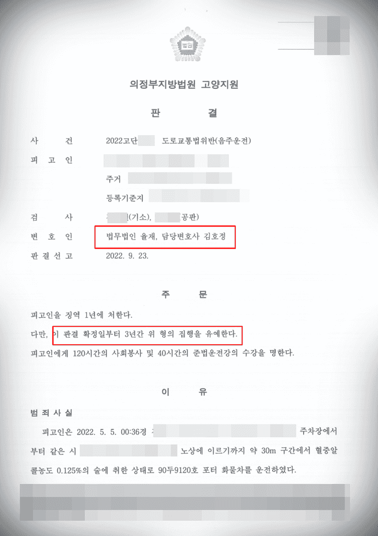 이 같은 상황에서 본 사건 의뢰인께선 4진 아웃이라는 가중처벌로 징역형 실형이 선고될 확률이 매우 높았고, 저희 율재는 최선을 다해 의뢰인의 형을 집행유예로 줄이기 위해 고군분투했던 사건으로 기억합니다.