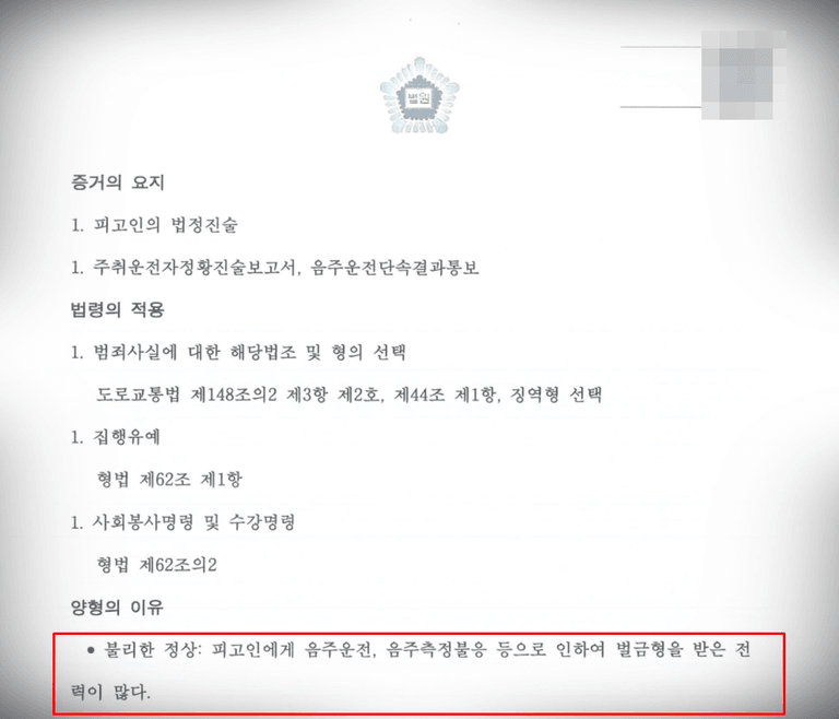 본 사건이 발생했던 때는 음주운전 가중처벌(윤창호법)에 대한 위헌 결정에 따라 도로교통법이 개정되지 않았던 시기입니다. 따라서 실제로 10년이 한참 지난 음주운전 처벌 경력도 가중처벌 대상에 포함되는 사례가 많았습니다. 더불어 사회적 분위기도 음주운전에 대해 매우 좋지 않았죠.