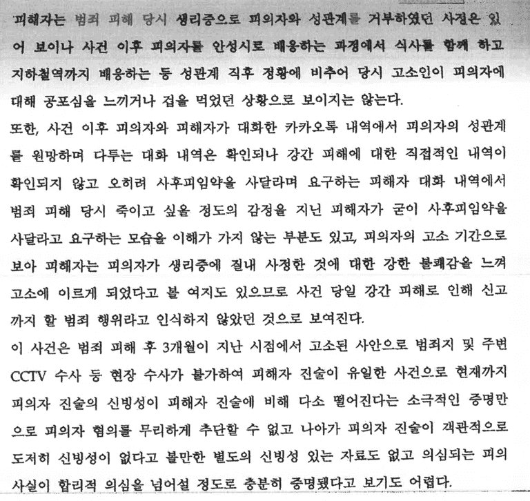 이에 본 변호인은 이상의 정황을 반박할 수 있는 매우 디테일한 사실관계들을 찾아내는 데에 초점을 맞춰 혐의를 벗겨내는 것을 목표로 한 뒤, 1) 피의자와 피해자가 그 이전에도 수회 성관계를 가진 사이로 포괄적이고도 묵시적인 성적 행위에 대한 동의 내지 양해가 되어있는 점, 2) 사건 당일에도 종일 피해자의 주거지에서 피해자와 의뢰인이 함께 침대에 누워 스킨십을 수차례 나눈 점, 3) 생리를 핑계로 성관계를 꺼려한 사실은 있으나 그 이후 피해자가 "콘돔도 없잖아"라고 말하며, 마치 콘돔이 있다면 성관계에 응할 수도 있다는 취지의 발언을 한 사실, 4) 피해자가 주장하는 사건 직후 둘의 동선(함께 식사와 커피를 마시는 등 일반적인 데이트를 함), 5) 그 이후 카카오톡을 통해 "사후 피임약 사줘"라고 말한 사실 등을 지적하여 이 사건 피해자의 고소가 다소 신빙성이 떨어지는 점을 지적해냈습니다.