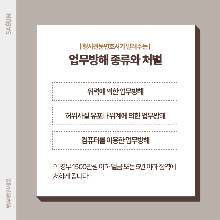 업무방해는 말 그대로 업무를 행하기 어렵게 방해하는 경우 성립이 됩니다. 종류는 크게 3가지가 있는데, 위력에 의한 업무방해, 허위사실 유포나 위계에 의한 업무방해, 컴퓨터를 이용한 업무방해죄가 있습니다. 이와 같은 행위를 하는 경우 5년 이하 징역 혹은 1,500만 원 이하 벌금형에 처하게 됩니다.