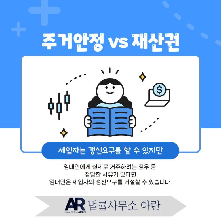이에 법률은 세입자는 갱신요구를 할 수 있되, 집주인이 실거주하려는 경우 등에는 갱신요구를 거절할 수 있다고 규정함으로써 둘 사이의 조화를 도모하였습니다.