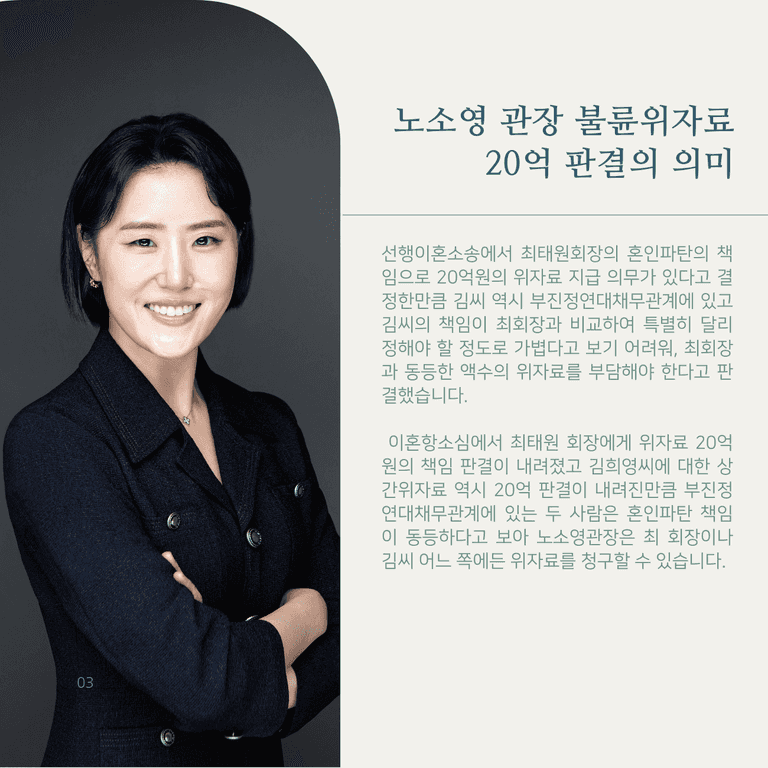 특히 선행이혼소송에서 최태원회장의 혼인파탄의 책임으로 20억원의 위자료 지급 의무가 있다고 결정한만큼 김씨 역시 부진정연대채무관계에 있고 김씨의 책임이 최회장과 비교하여 특별히 달리 정해야 할 정도로 가볍다고 보기 어려워, 최회장과 동등한 액수의 위자료를 부담해야 한다고 판결했습니다.